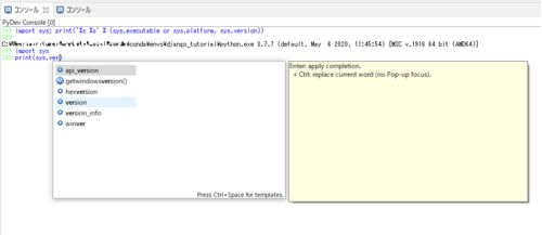 コンソールより、PyDevコンソールを選択すればよい。 すると利用するPythonを選べと言われるので、Console for currently active editorを選択する。 すると現在eclipseに設定しているPythonのインタープリターを選択する様に問われるので、お好きなインター…